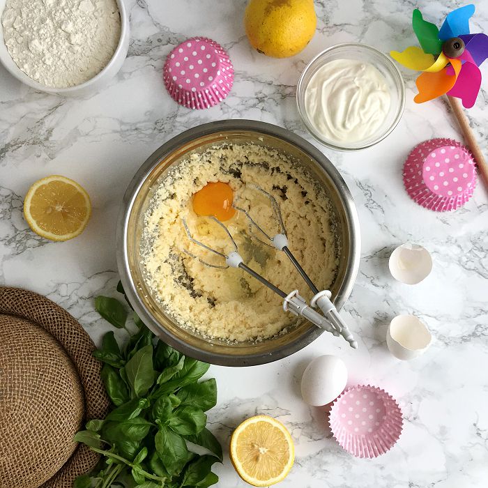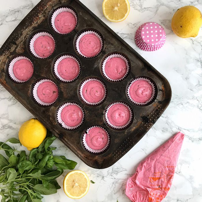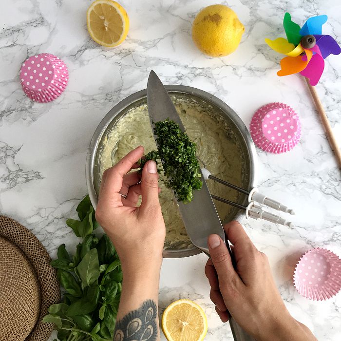 Сухие ингредиенты: муку, разрыхлитель и мятную пудру, смешаем и просеем в кексовую массу. Объединим все с помощью миксера. Вмешаем в массу мелко нарезанный свежий базилик и лимонную цедру. Добавим каплю розового красителях для настроения. Мы остановились на «Deep Pink» от AmeriColor.