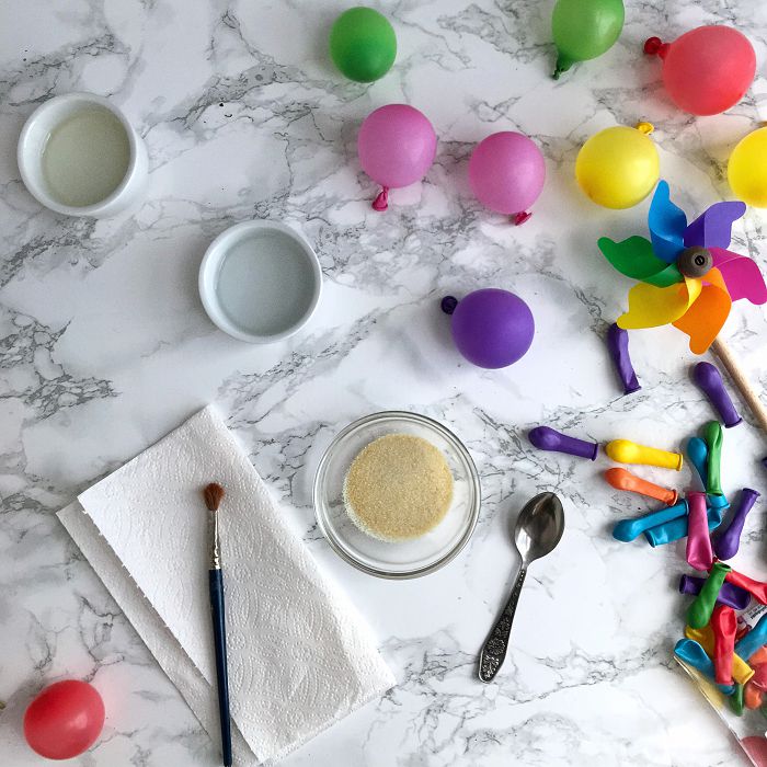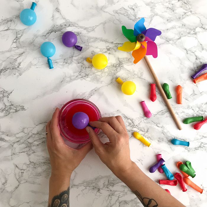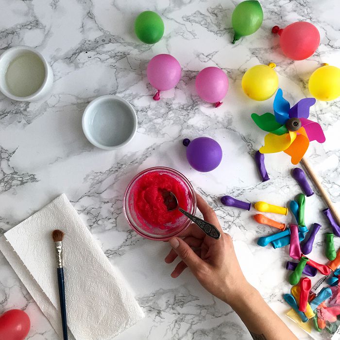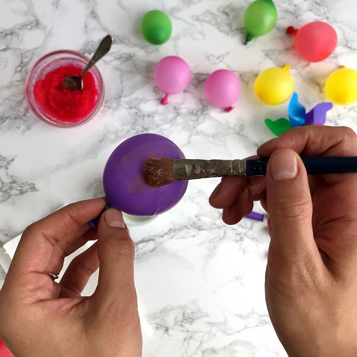Надуваем воздушные шарики. Постарайтесь найти самые маленькие шарик из возможных. Каждый шарик с помощью широкой кисти смочим растительным маслом.