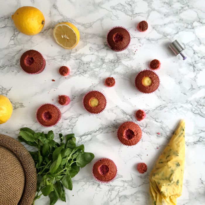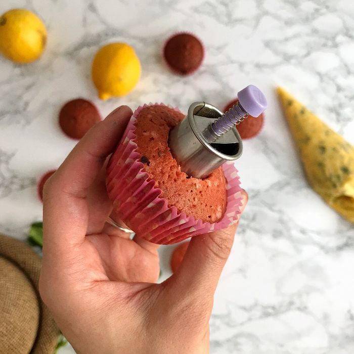 С помощью пресса удаляем сердцевину каркейка и заполняем серединку лимонный курдом. Накрываем отверстие бисквитной шапочкой. Кондитерский мешок с любимой фигурной насадкой заполняем кремом и отсаживаем его на капкейки.