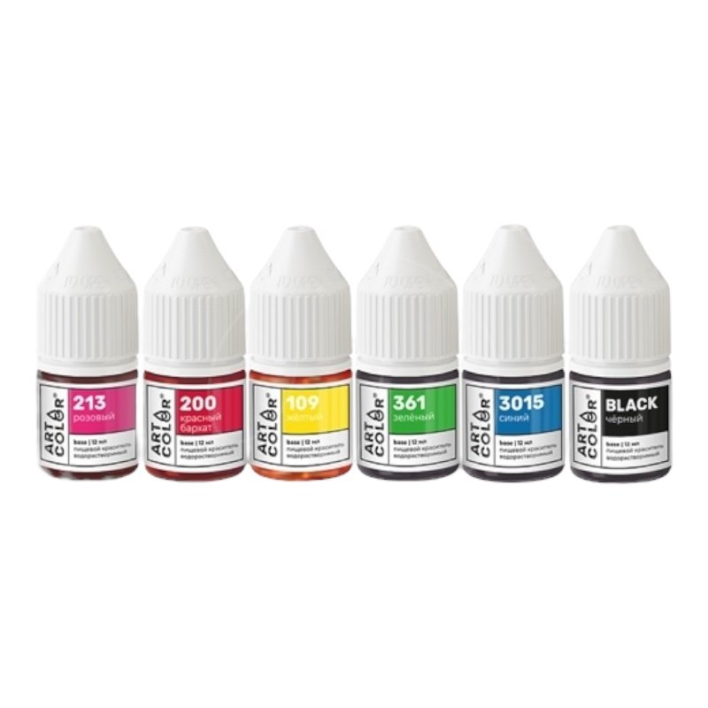 Набор пищевых гелевых красителей Art Color Base содержит 6 цветов: розовый, красный бархат, желтый, зеленый, синий, черный.