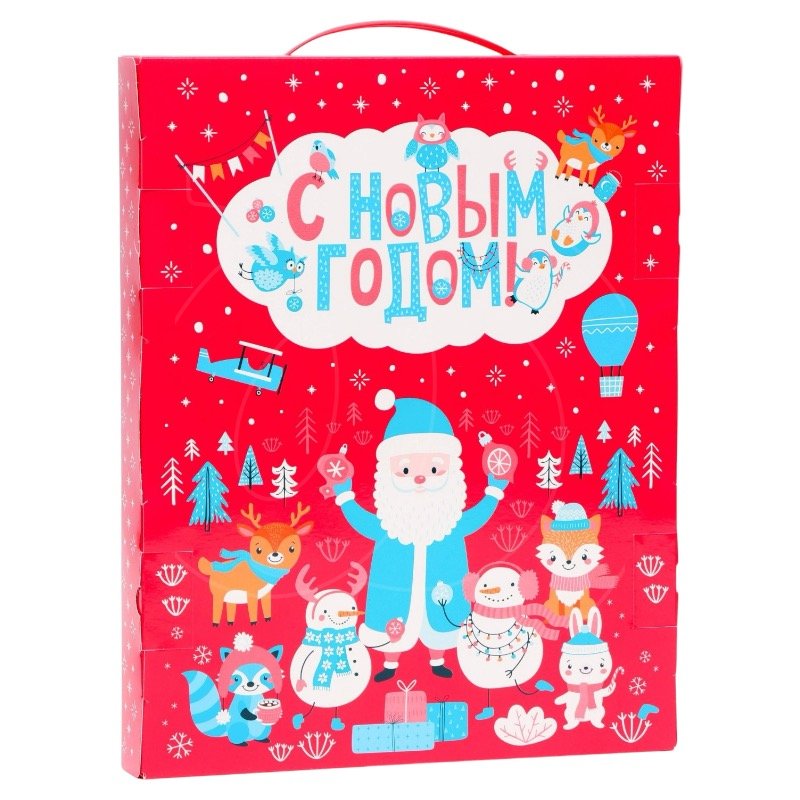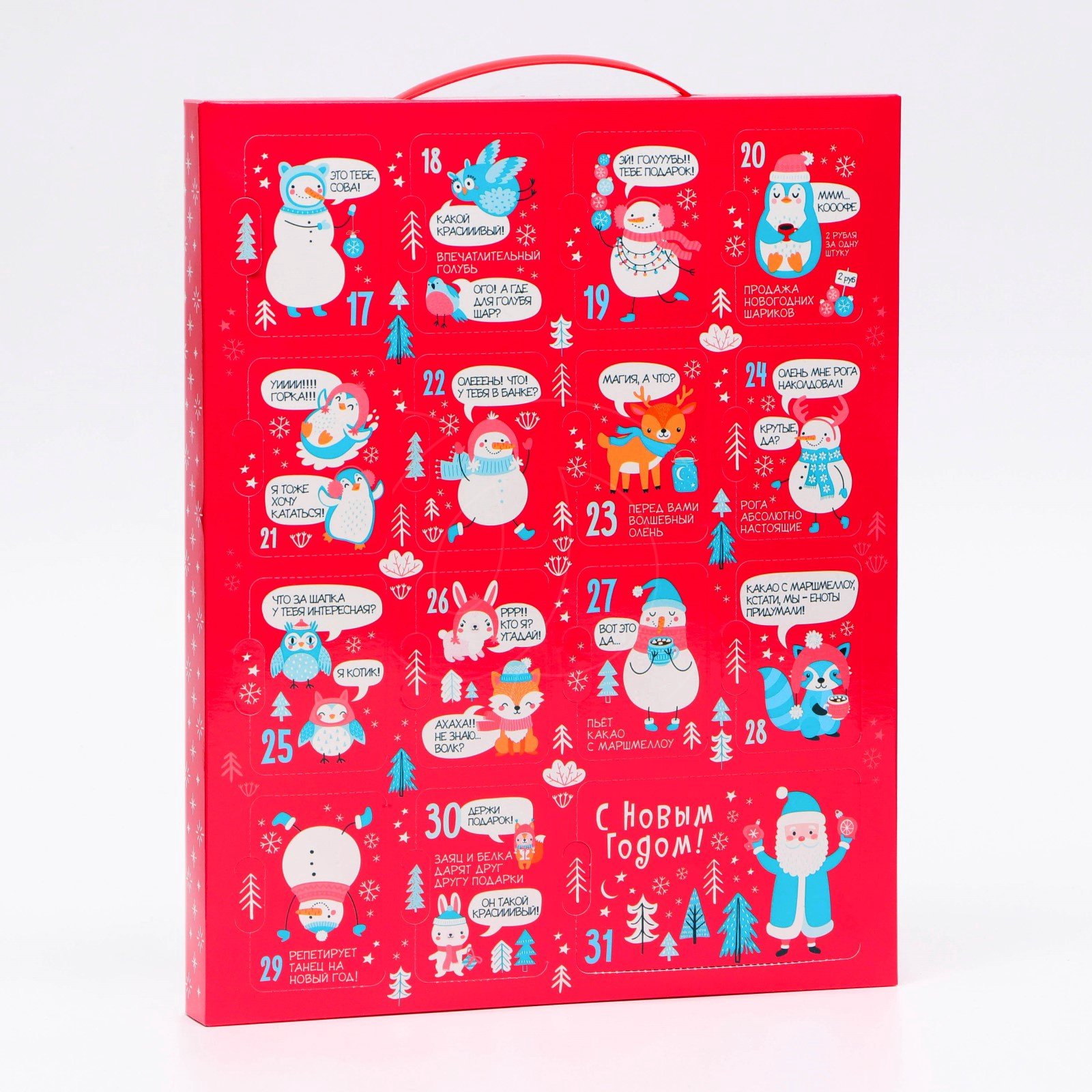 Коробка полностью готова: праздничный и яркий дизайн, отдельные окошки с нумерацией и вложение с индивидуальными ячейками.