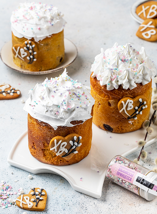 9. Готовые куличи остудите и украсьте меренгой. Сверху посыпьте фирменной посыпкой MIXIE.