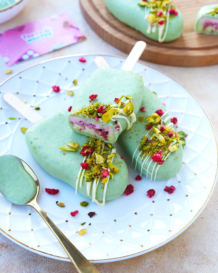 5. Вставьте деревянные палочки для эскимо. Выложите фисташковый слой, равномерно распределите и слегка постучите, чтобы масса равномерно распределилась по форме.