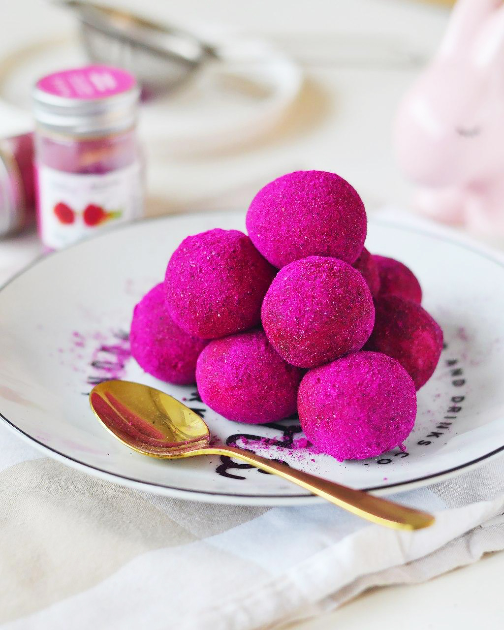 9. Насыпьте в глубокую миску натуральный краситель MIXIE "Розовая Питахайя", аккуратно обваляйте каждый трюфель, снимая лишнее.
