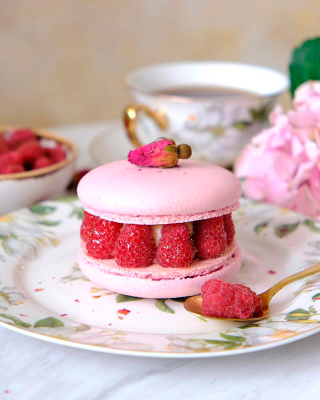 2. Выложите на крышечки, которые лежат дном вверх, свежую малину острым концом вверх - выбирайте малину одинакового размера. Понадобится примерно 8-9 штук на одно пирожное.