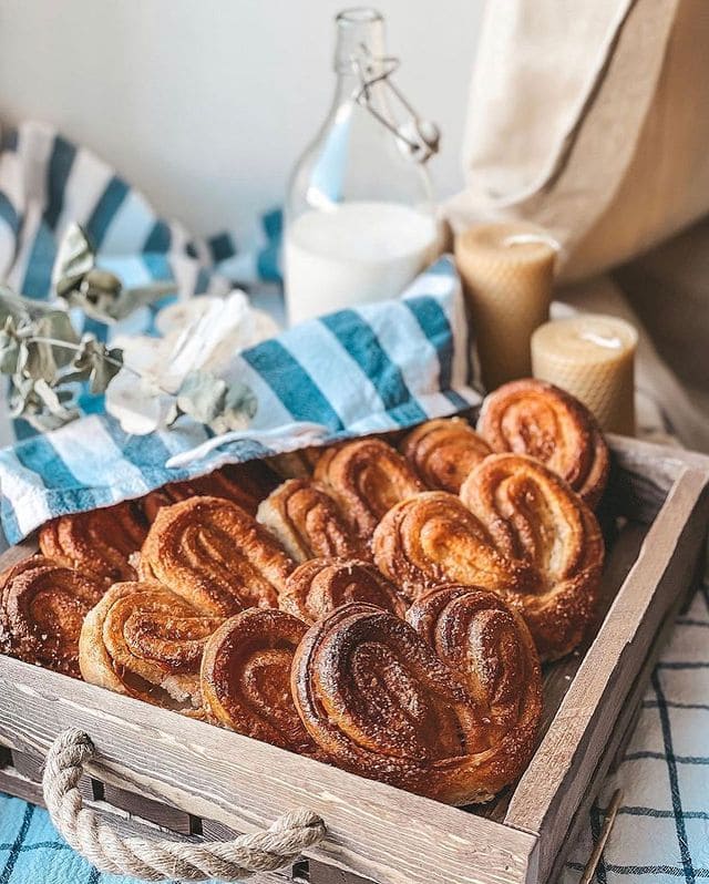 6. Из каждого кусочка сформируйте шарик, раскатайте, смажьте мягким сливочным маслом, присыпьте сахаром со специями. Сложите сердечком и готовые булочки-сердечки разложите на противень с пергаментом. Накройте полотенцем или плёнкой и снова уберите на расстойку примерно на 30 минут.