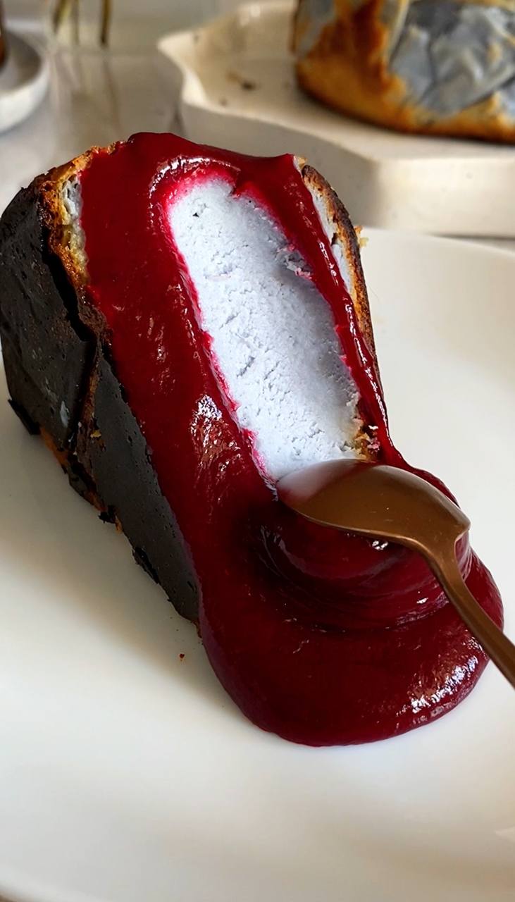 Рецепт: Бакский чизкейк с голубой матчей под ягодным соусом